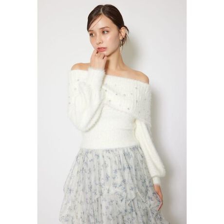【ふわふわのシャギー編み地にビジューの装飾が可愛いニットトップス】■ポイント昨年大人気だったシャギーオフショルニットに新色を追加して再登場。毛足がランダムなシャギーニットの編み地に大小の大きさのビジューを散りばめてデコラティブなアイテムに仕上げました。■ディテールオフショルのデザインで女性らしい印象にし、身頃とオフショルの編み地を変化させました。オフショルダーの部分にはワイドリブでビジューを施し、身頃部分は天竺の柔らかいイメージで製作したのも拘りです。■スタイリング短丈なのでアウトコーデにすると簡単にスタイルアップが叶いお勧めです。■生地透け感:なし裏 地:なし伸縮性:あり光沢感:なし厚 さ:やや厚手の編み地■商品のお気に入り登録お気に入りアイテムの再入荷・在庫1点などの通知を受け取ることができます。[注意事項]※画像の商品はサンプルです。実際の商品と仕様、加工が若干異なる場合があります。※画像の商品は光の照射や角度、お使いのモニター環境により、実物と色味が異なる場合がございます。※着用、お取り扱いの際は、アテンションタグをご確認ください。