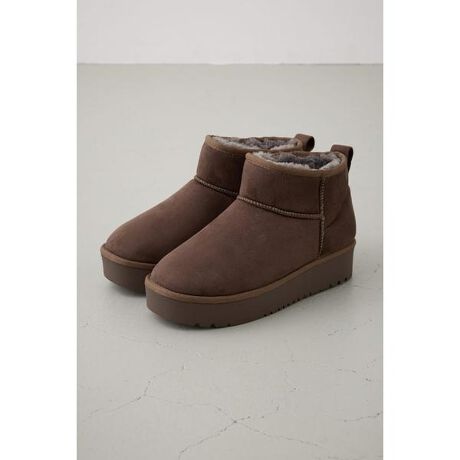 ■厚底ムートンショートブーツ ■ポイント今季トレンドの厚底のムートンブーツです。■ディテール内側にはファーがついていて防寒効果もあるのでこれからのシーズンに大活躍間違いなし。ボリューム感のある見栄えですが、見た目よりも軽量で履き心地と足がきれいに見えるフォルムにこだわりました。定番のベージュとどんなスタリングにも合わせやすいブラック、カジュアルすぎず大人な印象のブラウンの3色展開です。この秋冬に1足は持っておきたいおすすめのブーツです。■スタイリングカジュアルスタイリングにはもちろんスカートやワンピースなどとの合わせもおすすめです。■素材濡れたままで長時間放置したり、他の素材と密着させないように保管してください。表材、裏材は摩擦により色落ちする事がありますので、ご注意ください。濃色品は摩擦により色落ちが生じる場合があります。特に湿った状態では目立ちますのでご注意ください。淡色の衣類や雑貨との組み合わせはお避け下さい。ボア部分は湿気や摩擦で靴下に色移りしやすい為、淡色の靴下を避けてください。[注意事項]※画像の商品はサンプルです。実際の商品と仕様、加工が若干異なる場合があります。※画像の商品は光の照射や角度、お使いのモニター環境により、実物と色味が異なる場合がございます。※着用、お取り扱いの際は、アテンションタグをご確認ください。