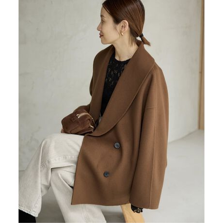 大きめなショールカラーが新鮮な印象のハーフコート。
