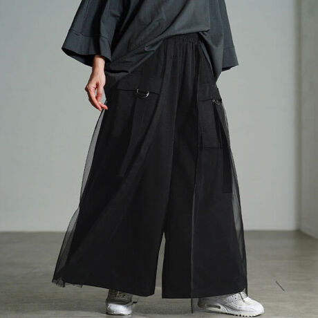 いつものコーデがグッと格上がるチュールレイヤードワイドカーゴパンツの登場です!ワイドカーゴパンツにチュールの巻きスカートを合わせたような個性派デザイン☆ボーイッシュ&モードな雰囲気が加速するラフなルーズ感で気になるヒップライン&脚のラインをカバー◎動くたびにチラリと足首が覗く着丈設定で多様なシューズと相性抜群なのもオススメポイント!レイヤードされたチュール&ベルトがモードな雰囲気を醸し出す主役級の一着です☆