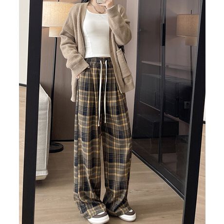 落ち着いたカラーのチェック柄が映えるワイドパンツ。