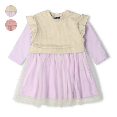 トレーナーにベスト、チュールスカートのドッキングデザイン。1枚で重ね着が楽しめる長袖ワンピース。肩のフリルも女の子らしい!【アイテム】トップス シンプル ガーリー フェミニン カジュアル お洒落 オシャレ かわいい 可愛い 普段着 デイリーウェア お出かけ着 お外着 お外遊び着 子ども こども 女児 女の子 ガールズ キッズ ベビーサイズ トドラーサイズ 幼稚園 保育園 小学校 通園 通学 小学生 2025年秋冬物新作 丸高衣料 ロングスリーブ 長袖 ラベンダー 薄紫色 ピンク クレセント