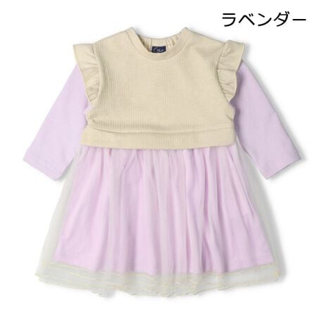 トレーナーにベスト、チュールスカートのドッキングデザイン。1枚で重ね着が楽しめる長袖ワンピース。肩のフリルも女の子らしい!【アイテム】トップス シンプル ガーリー フェミニン カジュアル お洒落 オシャレ かわいい 可愛い 普段着 デイリーウェア お出かけ着 お外着 お外遊び着 子ども こども 女児 女の子 ガールズ キッズ ベビーサイズ トドラーサイズ 幼稚園 保育園 小学校 通園 通学 小学生 2025年秋冬物新作 丸高衣料 ロングスリーブ 長袖 ラベンダー 薄紫色 ピンク クレセント