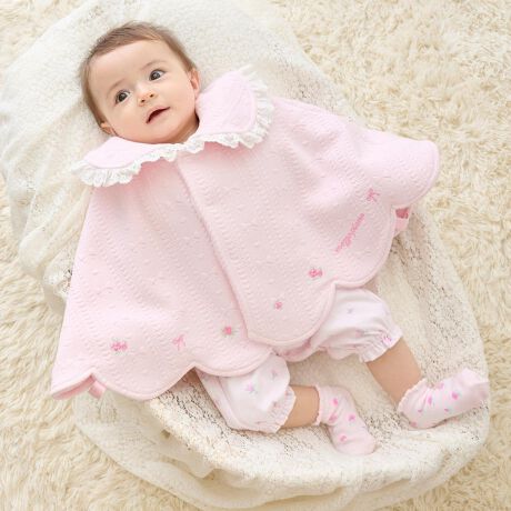 表面はバラの刺繍をあしらったメゾピアノオリジナルのリボン柄ふくれジャカード、裏面にボア生地を採用したリバーシブルで楽しめるベビーケープです。裾のスナップボタンを留めて腕を通すことで脱げにくく、着崩れ防止になります。他にもねんねのひざ掛けやおくるみとして、抱っこ紐の時のケープとしても使用が可能。あんよができるようになればマントとしても活躍するため、2歳半くらいまで長くご使用いただけます。ご自宅用はもちろんギフトにも喜ばれるアイテムです。バラ刺繍スカラップスタイ(品番:6253513)やバラ柄ソックス(品番:6253514)と組み合わせたギフトセットもおすすめです。