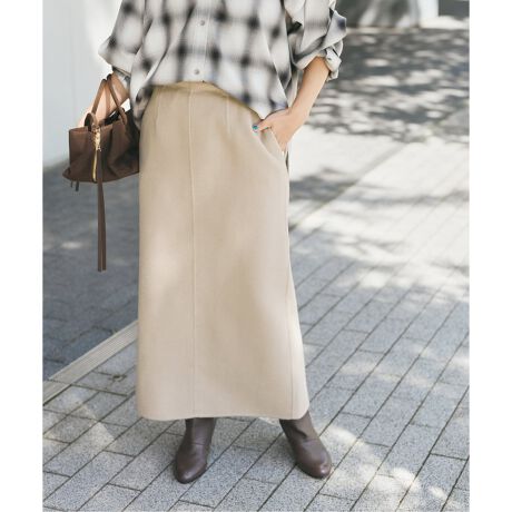 繊細で上質なダブルフェイス素材を贅沢にリバー仕立てすることで、軽やかさと高級感を兼ね備えたストレートスカート。