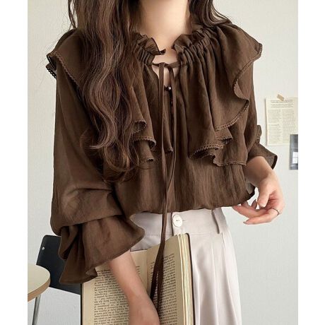 このブラウスは、前後2WAYデザインでラッフルデザインのフリル襟が特徴。