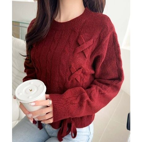 ケーブル編みにレースアップリボンをプラスした、華やかさと可愛らしさを兼ね備えたデザインニット。