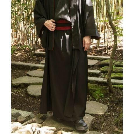[型番:7CQ-5316-2025]帯がセットになった着物風のメンズパンツ。衿と袖口に上品なジャカード生地を使用。腰部分にはそれぞれ、松・竹・梅の家紋の刺しゅうが入っています。同じシリーズのトップスや羽織と合わせることで、より着物のような着こなしに。ゆったりとしたサイズ感で、性別問わず着用いただけます。帯取り外し可能