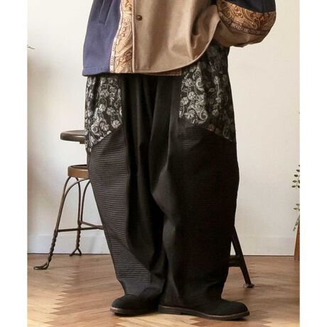 デニム・ストレッチツイル・ジャガードの異素材コンビネーションが目を惹くメンズパンツ。ヤオ族の伝統衣装からインスパイアを受けたデザイン。柔らかいストレッチ生地と軽やかな着心地、丸みのあるコクーンシルエットが特徴的。コーディネイトに個性をプラスしてくれるアイテムです。