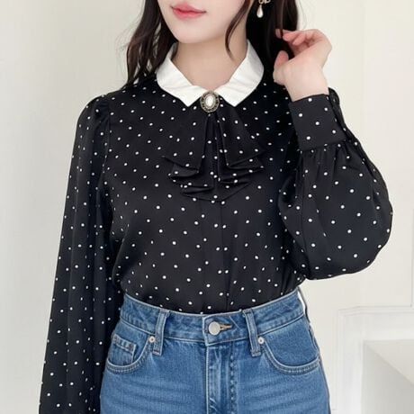 ブローチ付きのラッフルタイが上品なドットブラウス。