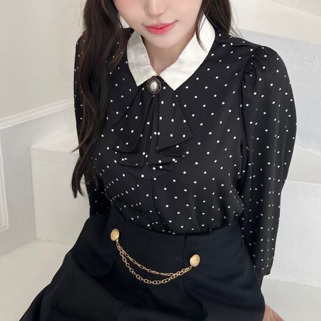 ブローチ付きのラッフルタイが上品なドットブラウス。