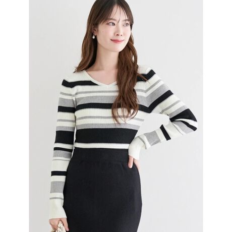 フェミニンな印象を叶える、ぴったりフィットのVネックボーダーニット