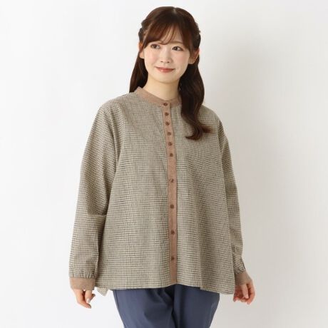 スタンドカラーで衿元をすっきりさせ、多ボタンでアクセントをつけた1枚です。
