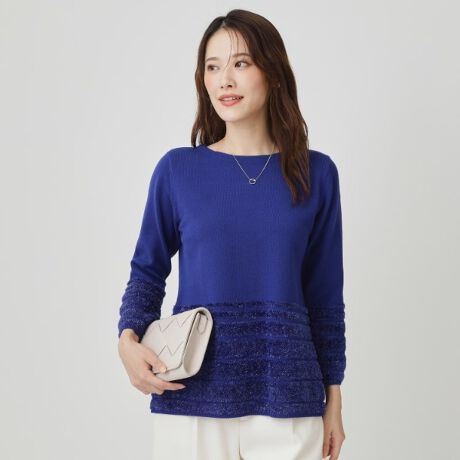 裾と袖口にあしらわれたラメフェザーのボーダーデザインが、華やかでリュクスな印象を与えるニットトップス。