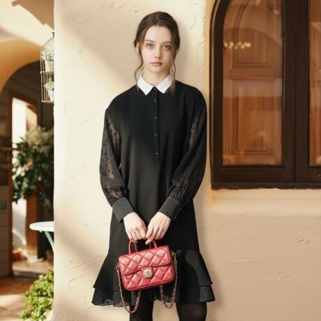 3素材を組み合わせる事で、ダブルクロスのきちんとした印象とシアードットの軽やかさ、サテンの華やかさが加わったエレガントなワンピース。
