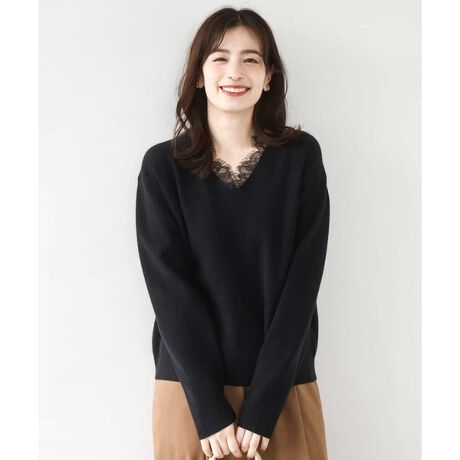 一枚で着映える女性らしいVネックラインと、お顔まわりを華やかにするレース使いがポイントのニットプルオーバー。オーバー過ぎないながらも大人のこなれ感を感じるサイズ感のドロップショルダーデザイン。