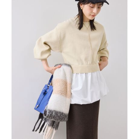 ニットとシャツをドッキングした、1枚でレイヤードスタイルが楽しめるトップス。上身頃はコンパクト見えするニット、裾には布帛シャツを組み合わせることでメリハリをプラスしました。ドロップショルダーのゆるっと感がリラックスムードを演出しつつ、シャツ裾のふんわり広がるシルエットが女性らしさを引き立てます。