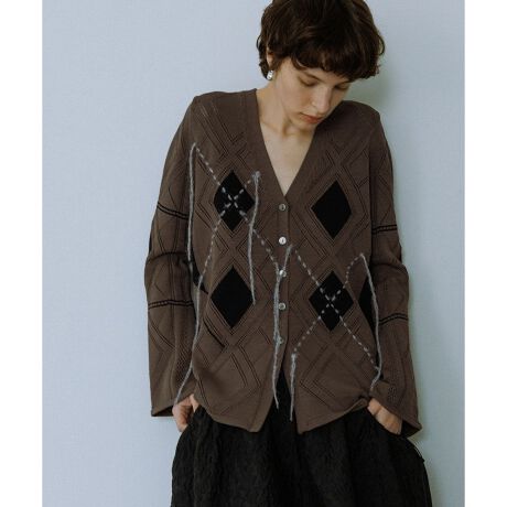 アイレットやインターシャを組み合わせ変形アーガイル柄を組んだニットカーディガン。