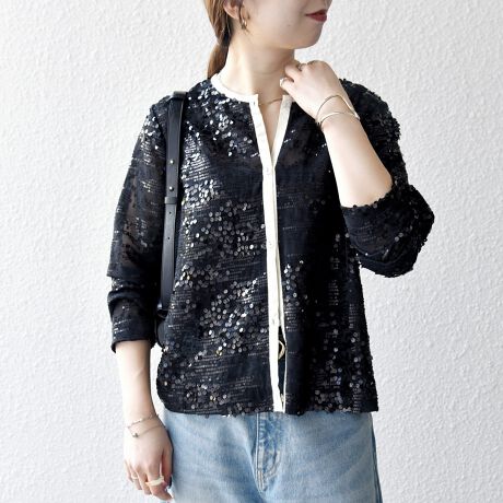 スパンコールは全面ではなくニュアンスの出る配置で、ジャカードの柄とも重なりカジュアルスタイルにもはまるオシャレな印象に。