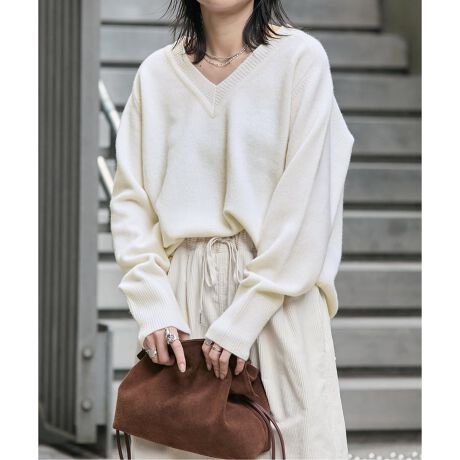 カシミヤ混の、もっちりとした柔らかい手触りの素材。一枚着でも、ジャケットやアウターのインでも使いやすい肉感です。ベーシックな使いやすいあきのVネックでワイドパンツなどともバランスのとりやすいジャストな着丈にしています。身幅にゆとりがあるのでとても楽に着られます。