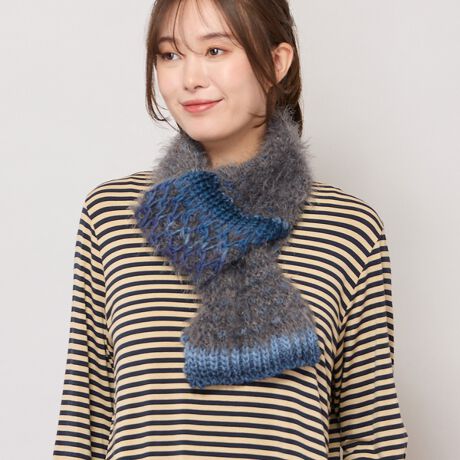 ざっくり手編みの様な編み目の面と、毛足のあるシャギーヤーンの面がドッキングされていて、気分で裏表を変えられるリバーシブルで、コーディネートの幅が広がります。