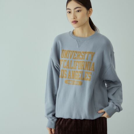 アウターを着用するコーディネートでもスタイリングのポイントになるように、前身頃はオーセンティックなカレッジロゴをフロッキープリントし、袖口にはワッペン刺繍を施しています。