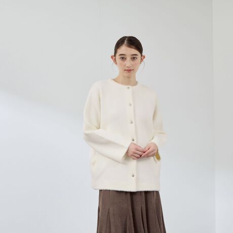 前を締めてプルオーバーとしてもご着用が可能で、コーディネートするハイネックインナーやボウタイリボンブラウスなどを合わせて首元を変えるだけで異なった印象に導きます。