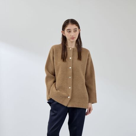 前を締めてプルオーバーとしてもご着用が可能で、コーディネートするハイネックインナーやボウタイリボンブラウスなどを合わせて首元を変えるだけで異なった印象に導きます。