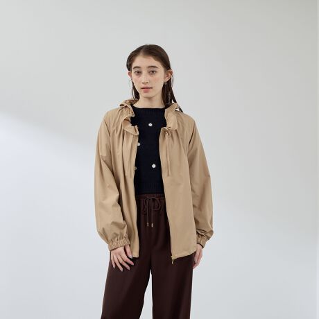 マウンテンパーカーのスポーティさとブラウスライクなフリルネックのデザイン性が共存するライトアウターです。