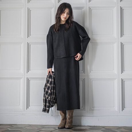 スウェード調ジャージーと、軽量ポリエステルニットをドッキングさせた、、スカートセットアップ。