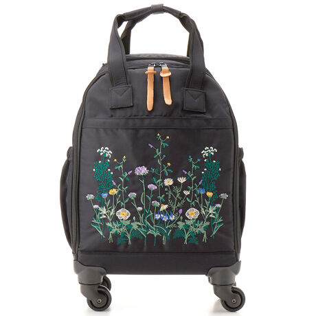 [型番:34010054]glantaシリーズ初のキャスター付きキャリーバッグ。収納式のハンドルが付いているので、重さのある荷物も楽に運ぶことが出来ます。表面にはお花の刺繍を大胆に施しました。外側、内側それぞれにポケットが付いていて収納力も抜群で、1〜2泊程度の旅行にもおすすめです。容量:19L重さ:2kg外ポケット:3個内ポケット:1個