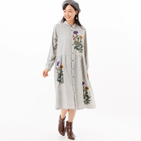 コットンビエラ先染めシャンブレービッグポピーブーケ刺繍シャツワンピース(前開き)