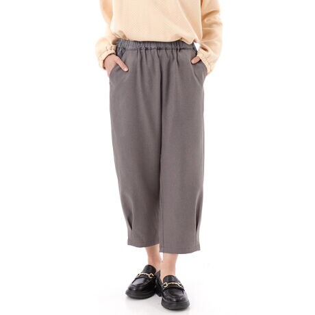 [型番:34160554]裾にタックを入れた緩やかなコクーンシルエットのテーパードパンツ。ウエストとポケットにはベロア生地を使用してアクセントにしました。温かみのある素材感が、冬の装いにぴったりのアイテムです。ウエストはゴム&紐で快適な履き心地です。
