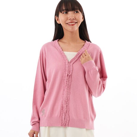 [型番:34840254]タックフリルが胸元にあしらわれた、フェミニンなVネックカーディガン。素材には、細番手のコットンアクリル糸を使用しました。コットンの柔らかさと通気性、アクリルの軽さと保形性を兼ね備え、さらりとした肌触りと軽やかな着心地が魅力です。秋口の羽織にも、寒くなってからのコートのインナーにも活躍するアイテムです。