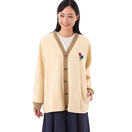 [型番:34940354]ダブルフェイスのキルティング素材の、Vネックカットカーディガン。保温性に富んだ柔らかい肌触りが特徴の生地で、温かくご着用いただけます。袖口と前立てにリブを取り入れ、胸元には温かみのあるお花のハンド刺繍を添えました。季節の変わり目に活躍するアイテムです。