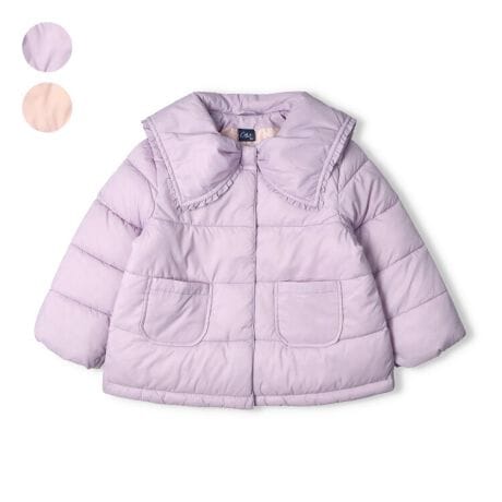 フリルの付いたリボンデザインの衿が女の子らしい!無地デザインでどんなアイテムとも合わせやすい!ナイロン素材の中綿入りジャケット、ジャンパー、アウター。【アイテム】無地 シンプル ガーリー カジュアル お洒落 オシャレ かわいい 大人可愛い 普段着 デイリーウェア お出かけ着 ロングスリーブ 長袖 アウター ブルゾン ジャンパー コート ジップアップ フロントジップ 子ども こども 女児 女の子 ガールズ キッズ ベビーサイズ トドラーサイズ 幼稚園 保育園 小学校 通園 通学 小学生 2025年秋冬物新作 丸高衣料 ラベンダー 薄紫色 ピンク クレセント