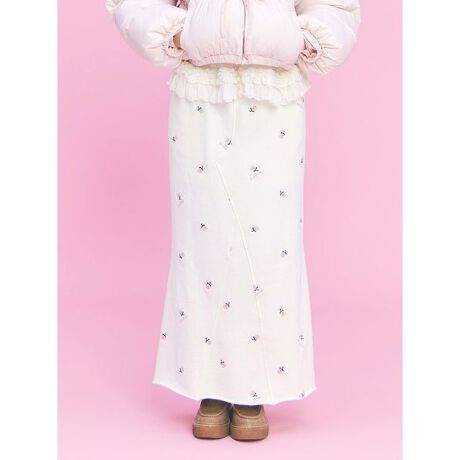 オリジナルのクロスステッチのバラ柄刺繍が施された程よい肉感の裏毛のロングスカート。デニムスカートのディテールを落とし込んだ切替えやリベットのデザインがアクセントになっています。ウエストぐるりゴムのストレスフリーな着心地になっており、綺麗めなシルエットで履けるように、裾に向かて広がっていくマーメイドシルエットにしました。