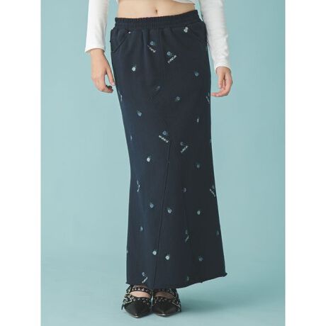 オリジナルのクロスステッチのバラ柄刺繍が施された程よい肉感の裏毛のロングスカート。デニムスカートのディテールを落とし込んだ切替えやリベットのデザインがアクセントになっています。ウエストぐるりゴムのストレスフリーな着心地になっており、綺麗めなシルエットで履けるように、裾に向かて広がっていくマーメイドシルエットにしました。