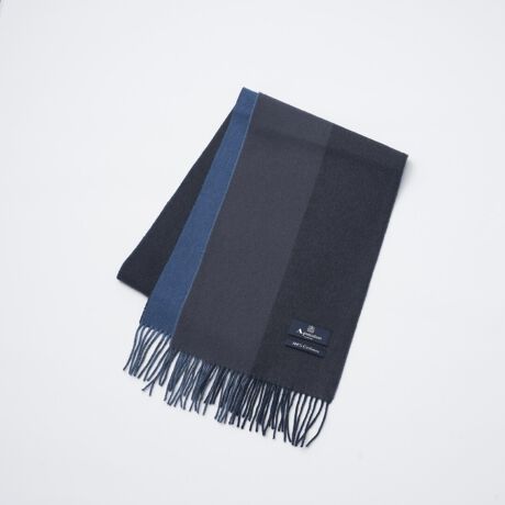 アクアスキュータムが誇るカシミヤ100%のマフラー。表裏それぞれに4ブロックのカラーを配したクォーターソリッドのリバーシブル仕様で、巻くだけで多彩な表情が生まれるデザインです。肉厚でボリューム感のある生地を程よい幅で織り上げ、巻きやすさと存在感を兼ね備えた一枚です。