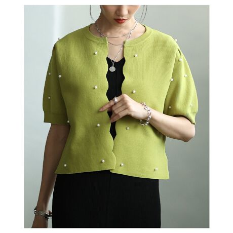 スポンジニットにパールが施されたカーディガンは秋口にぴったりの一着。ベーシックなブラックは勿論、グリーンもオリーブも差し色として意外と使いやすいんです◎ワンピースに羽織ったり、デニムとカジュアルに合わせるのもおすすめのコーデです♪