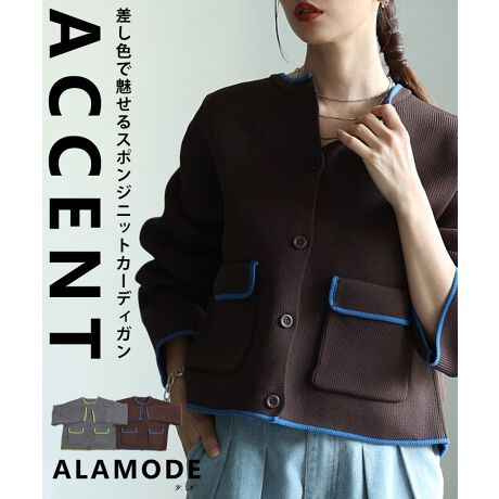 スポンジのような軽くモチっとした肌触りのニットを使用したカーディガンです。各カラー目を惹く差し色がスタイリングにアクセントをプラス。羽織りとしては勿論、トップスとして着こなしていただくのがおすすめです♪