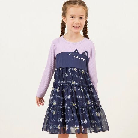 音楽家になったmimiちゃんとピアノや五線譜をモチーフにした総柄プリントのシフォンを使ったティアードのワンピース。ビスチェ風の切り替え部分には、Cocoの顔がデザインされていて、可愛らしいアクセントになっています。軽やかな素材で着やすく、これ1枚でも、ちょっとしたお出かけにも活躍しそうです。90は、左肩開きの仕様。