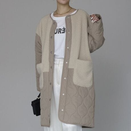 ボア生地とキルティングを切り替えた異素材をジョイントしたノーカラーコートをリリースしました。