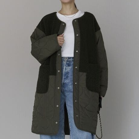ボア生地とキルティングを切り替えた異素材をジョイントしたノーカラーコートをリリースしました。