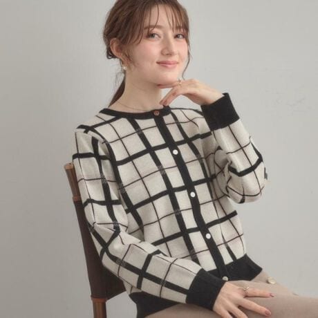 オリジナルのチェックジャカード編みの程良い肉感のあるニットカーディ