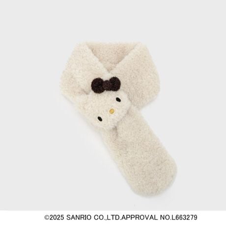 ふわふわのキティのお顔にティペットの先を通して留めるデザインで、差し込むだけで決まるので着用も簡単です。