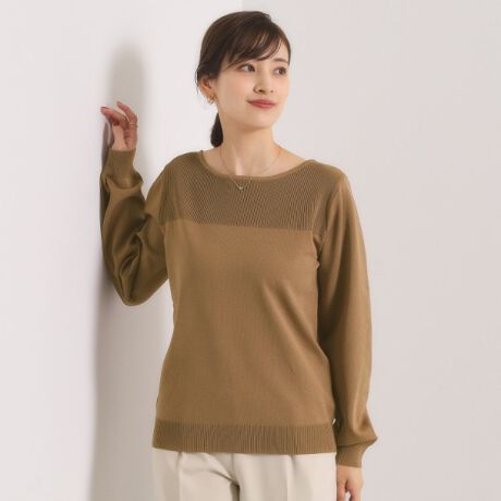 リブ編みで切り替えることで表面感を作り、顔周りが華やかに見えるデザインに。