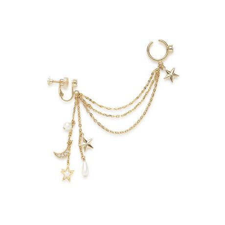 さまざまな形の月や星のチャームが揺れる、幻想的なデザインのイヤリング。カットの入った反射が美しいチェーンで流れ星を表現し、パールやクリスタルを散りばめて華やかさをプラス。耳元で輝くロマンティックなデザインです。