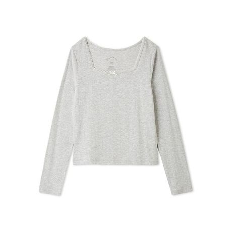 程良い厚みのある針抜きカットソーを使用したロングTシャツです。スクエア調のエレガントなネックラインがデコルテをきれいに見せるので、カーディガン等のインナーにも合わせやすい1枚。胸元にはピコレースと小さなリボンをあしらい、右袖口には手書き風のロゴもデザインしました。色はべーシックなオフホワイトとグレーの2色展開。同時期に展開するベビモコベアさがらカーディガンとコーディネートするのがおすすめです。