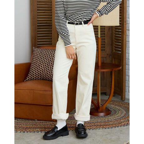 [型番:467RE703]畝が太目の表情豊かなコーデュロイを使用したストレートパンツです。横方向に伸び、裏面を起毛しているので肌ざわりの良さもポイントです。